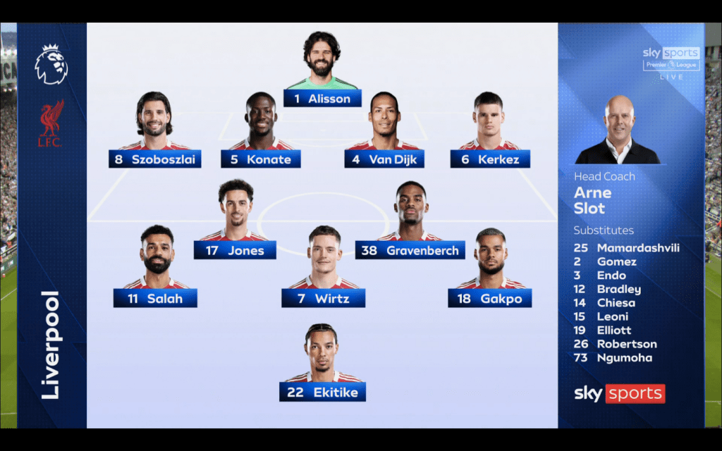 The lineups of both teams were missing some key players. New signing Jeremie Frimpong missed out due to an injury picked up last week, while Alexis Mac Allister was out due to personal reasons. Liverpool’s manager had to make some adjustments to his formation, where Dominik Szoboszlai gained his first experience as right-back with the Reds.