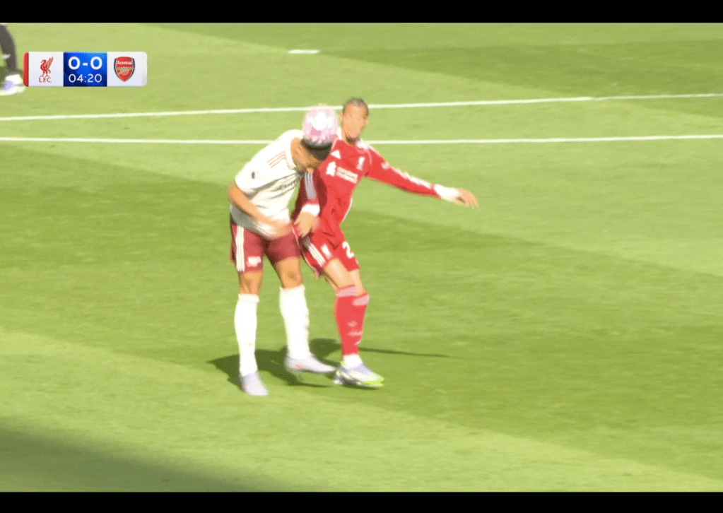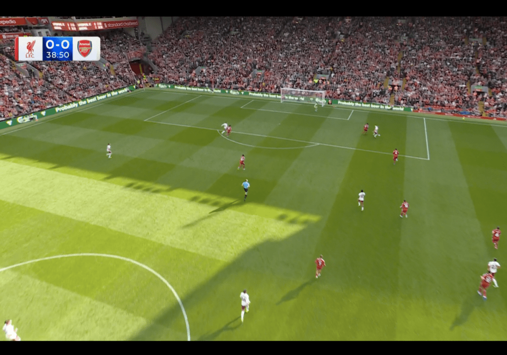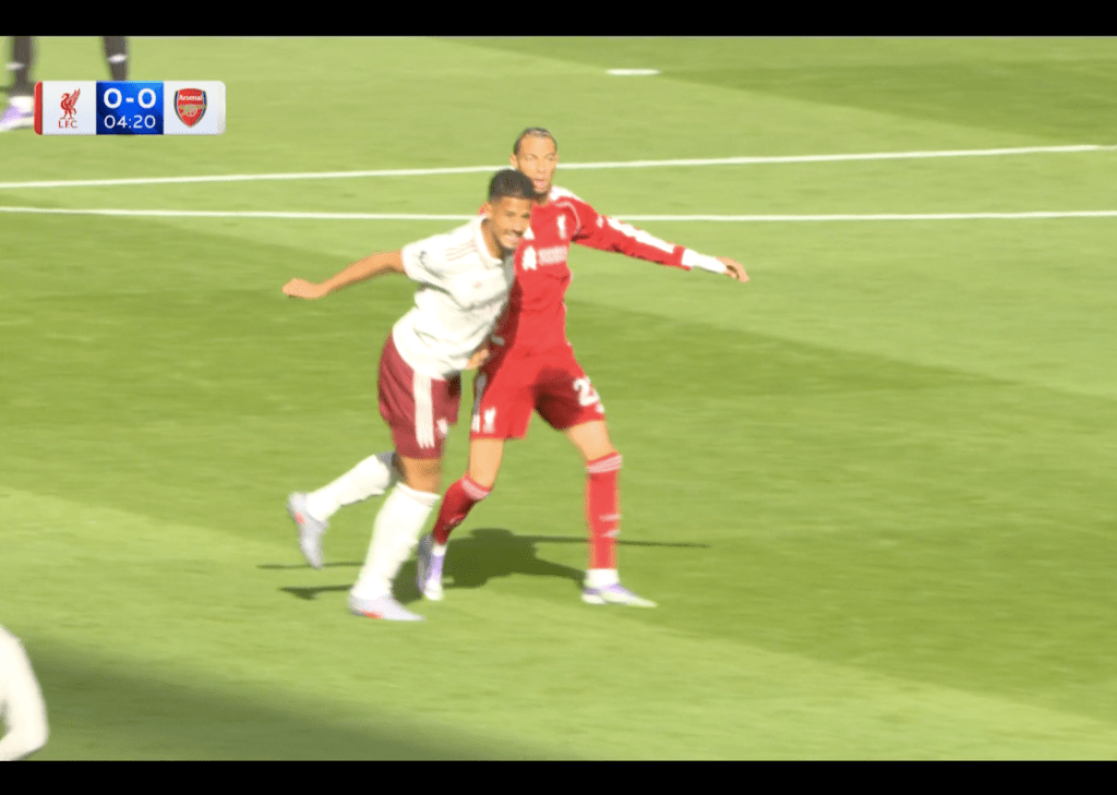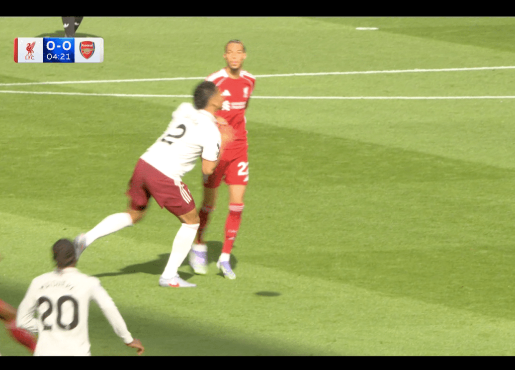 The visitors needed seventeen minutes to record their first corner as Liverpool kept defending in numbers. After twenty-three minutes, Arsenal led the number of touches in the opposition box by 7–0, most of these caused by set pieces. Due to that, we saw the first yellow card in the game handed to Ryan Gravenberch after trying to stop Riccardo Calafiori from going inside.